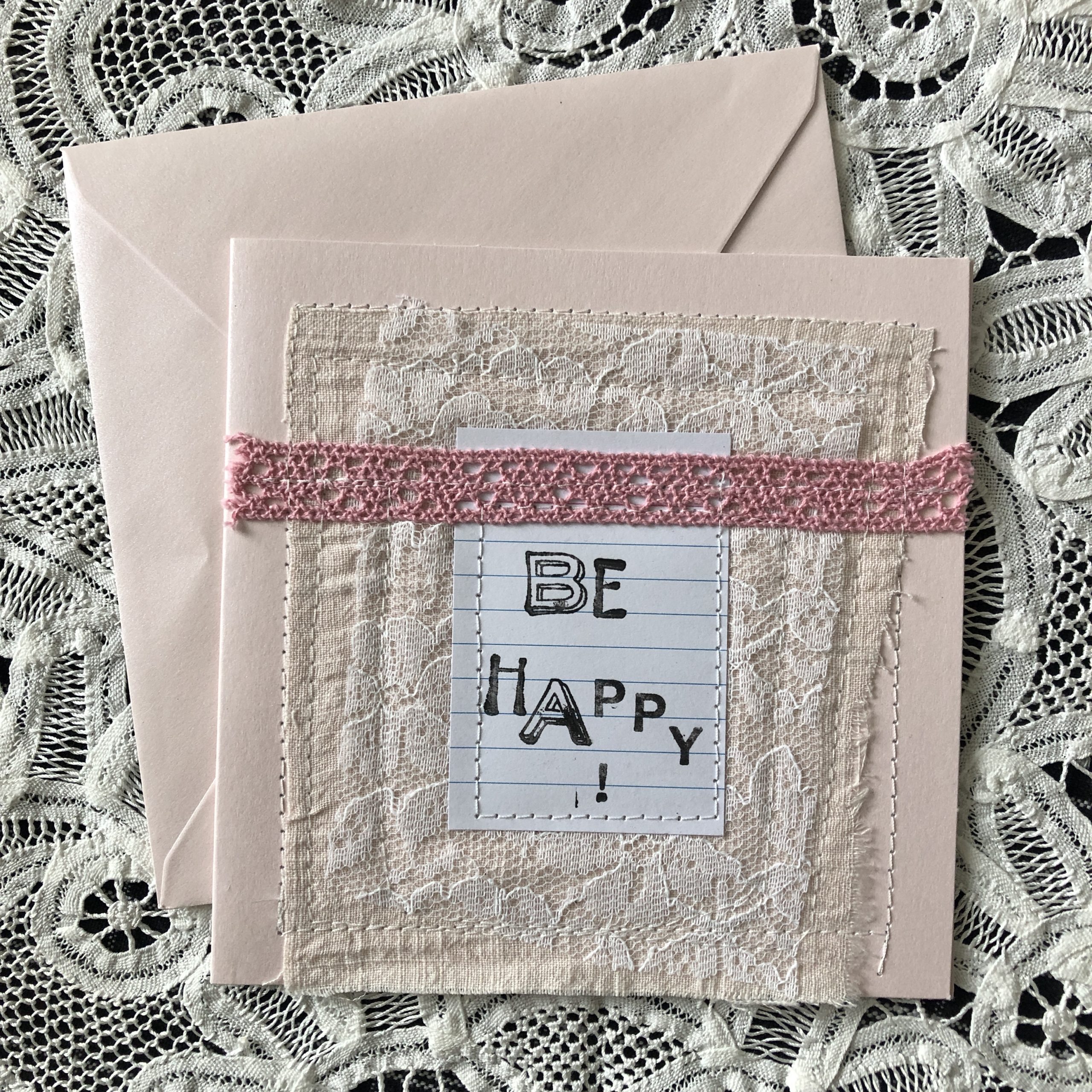 Eléments de dentelle, rubans, papier / étiquette, petit mot tamponné lettre à lettre et le tout cousu à la machine.
